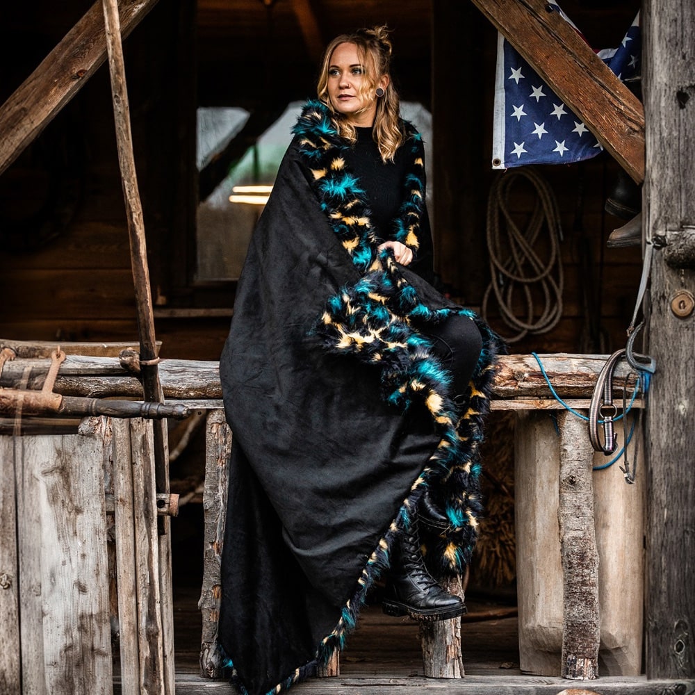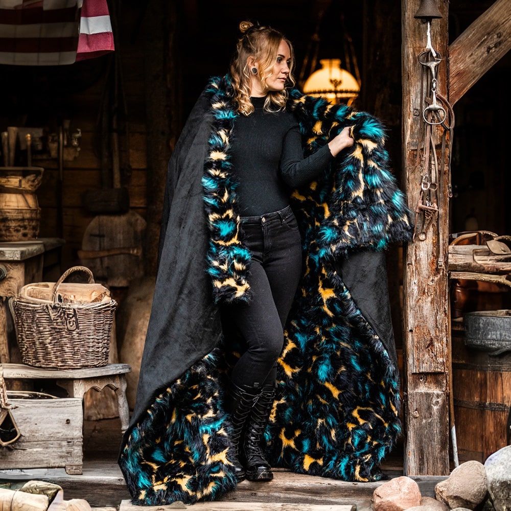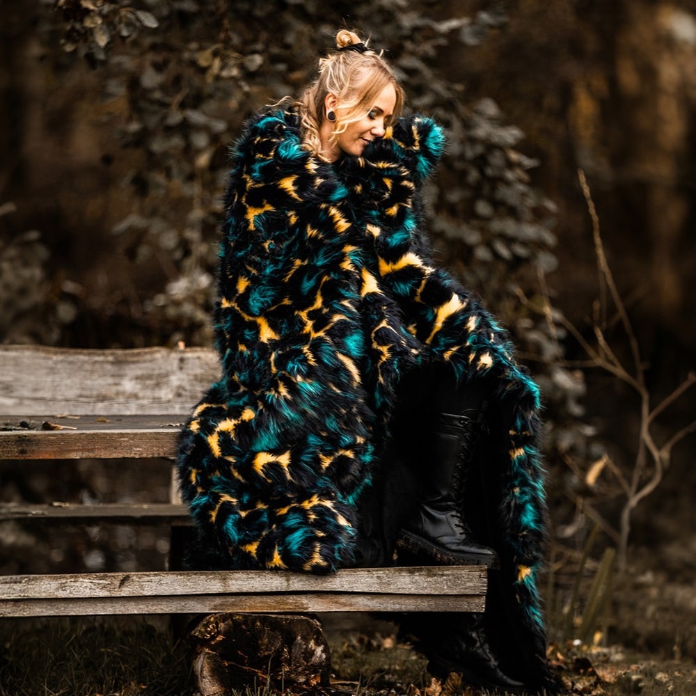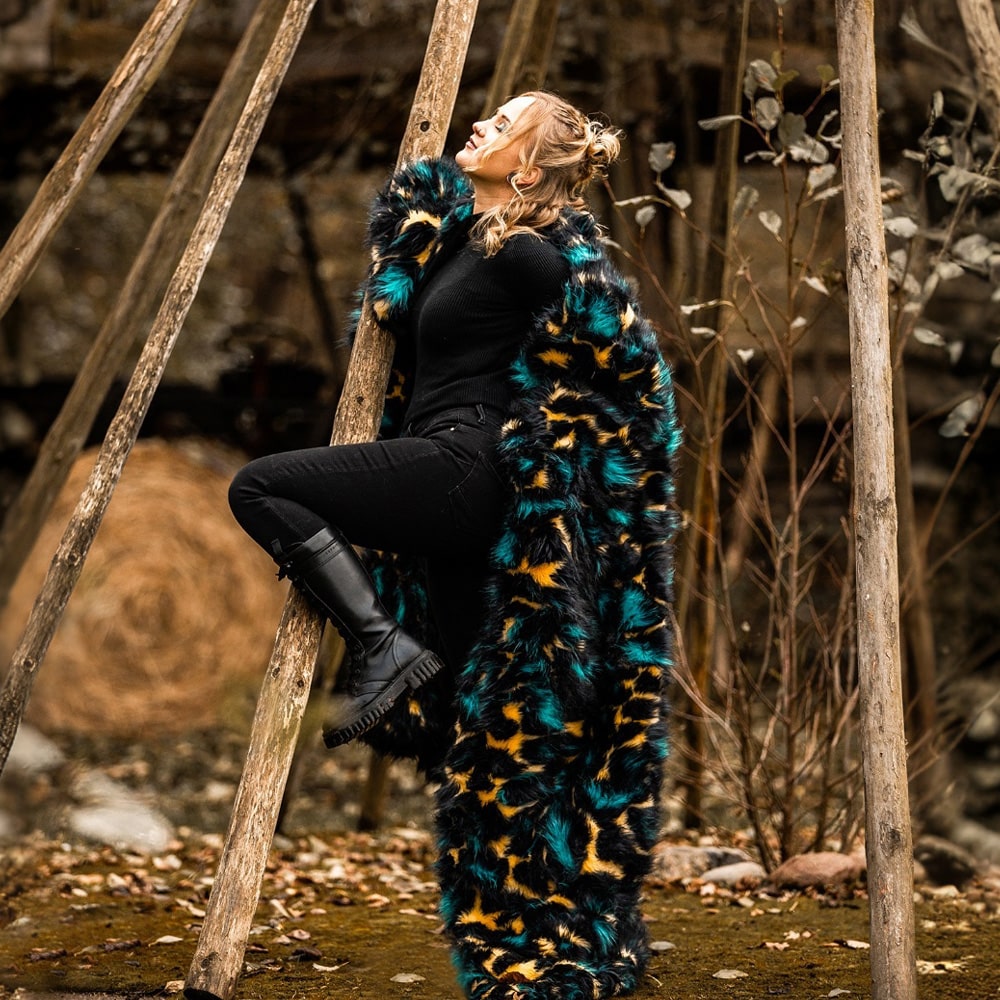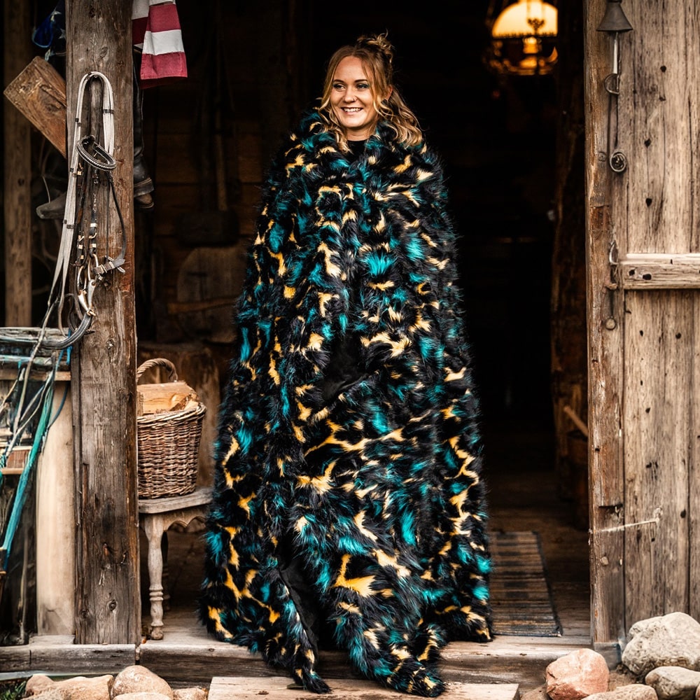 Bold and stylish, this blanket elevates the classic leopard print with the artistry of jacquard weaving, enhanced by vibrant pops of turquoise and neon yellow for a modern twist. Meticulously crafted, it combines high-quality jacquard faux fur with plush velvet using eco-conscious practices. The leopard-patterned faux fur side showcases intricate detailing and texture, while the reverse velvet side provides a luxuriously soft touch. Perfect for adding a striking and contemporary flair to your sofa or bed, this reversible blanket seamlessly blends wild elegance with refined craftsmanship.