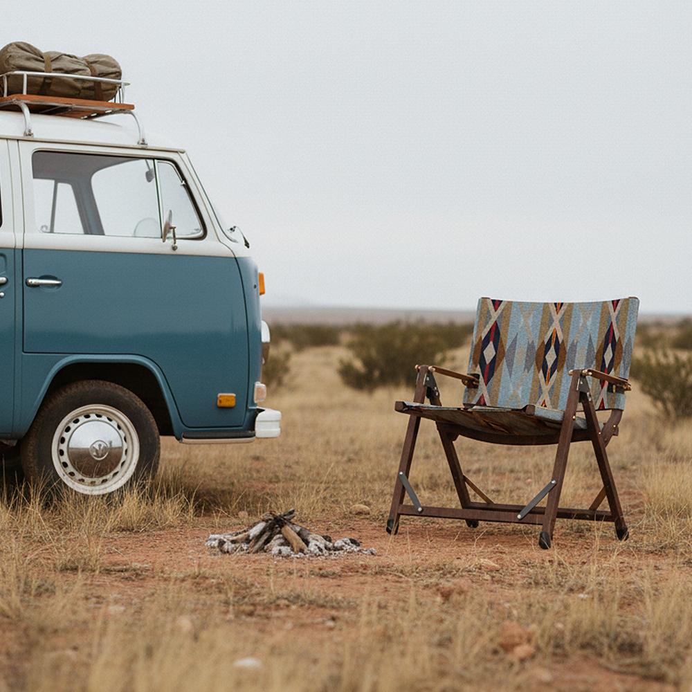 Featuring bold geometric patterns in classic Western style textiles and functional leather straps from nomadic traditions, the design merges Western heritage with portable practicality. The leather straps make folding, carrying, and lifting effortless.