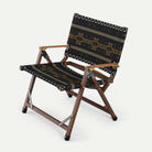 Dark brown wood frame folding chair with black base and orange geometric patterned fabric.