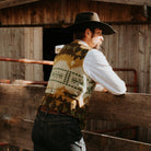 Designed for those who value both style and comfort. The exterior boasts premium faux cashmere, offering the luxurious look of classic wool with a cruelty-free touch, while the interior is lined with a soft, cozy fabric that moves with you. Four functional front pockets blend practicality with heritage-inspired design, complemented by vintage, worn-look buttons that nod to timeless craftsmanship. Whether layered over a crisp shirt or worn atop a tee, the Canyon Ridge Vest channels the enduring spirit of the open plains—where strength, resilience, and a touch of adventure meet.