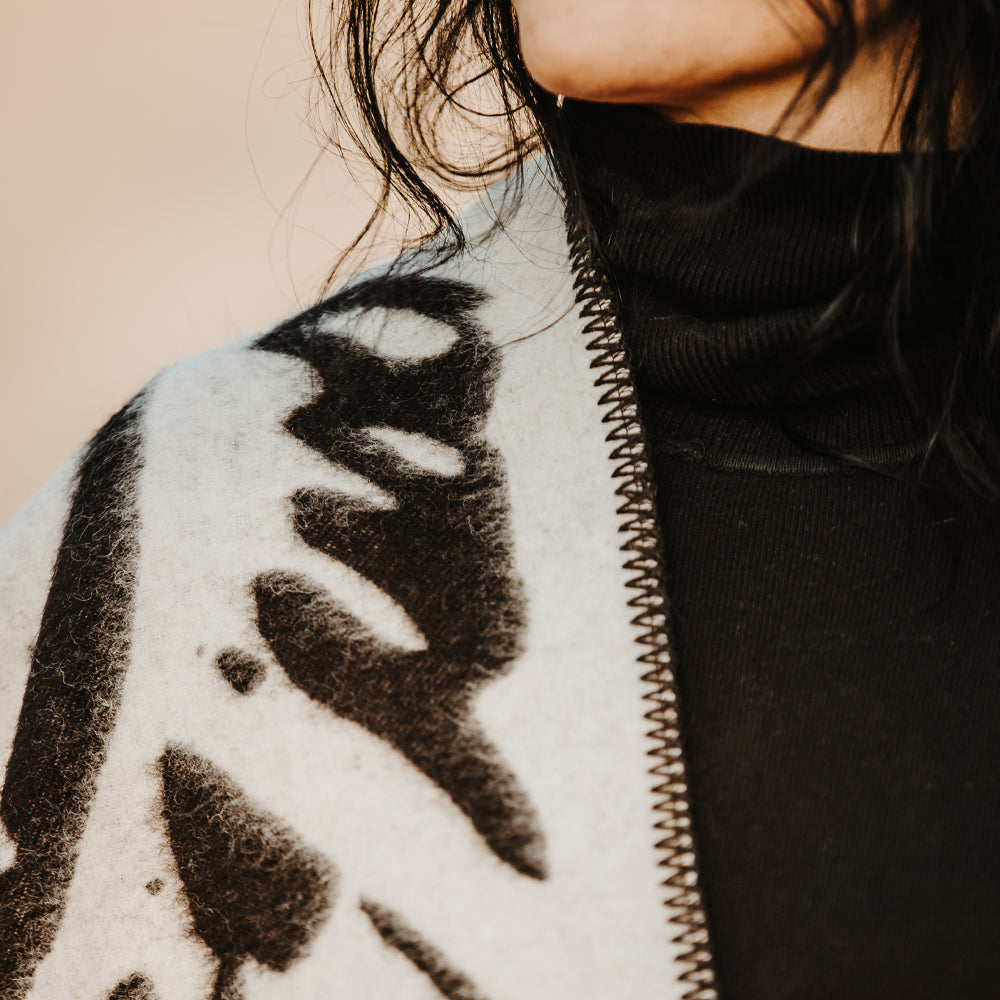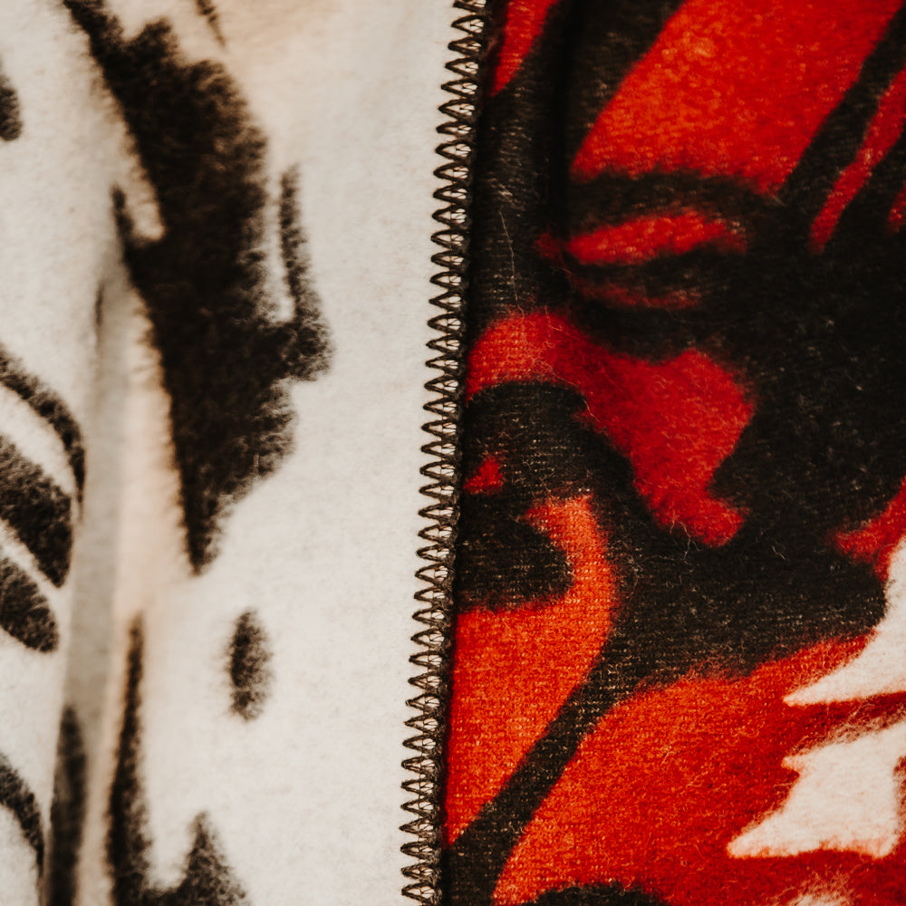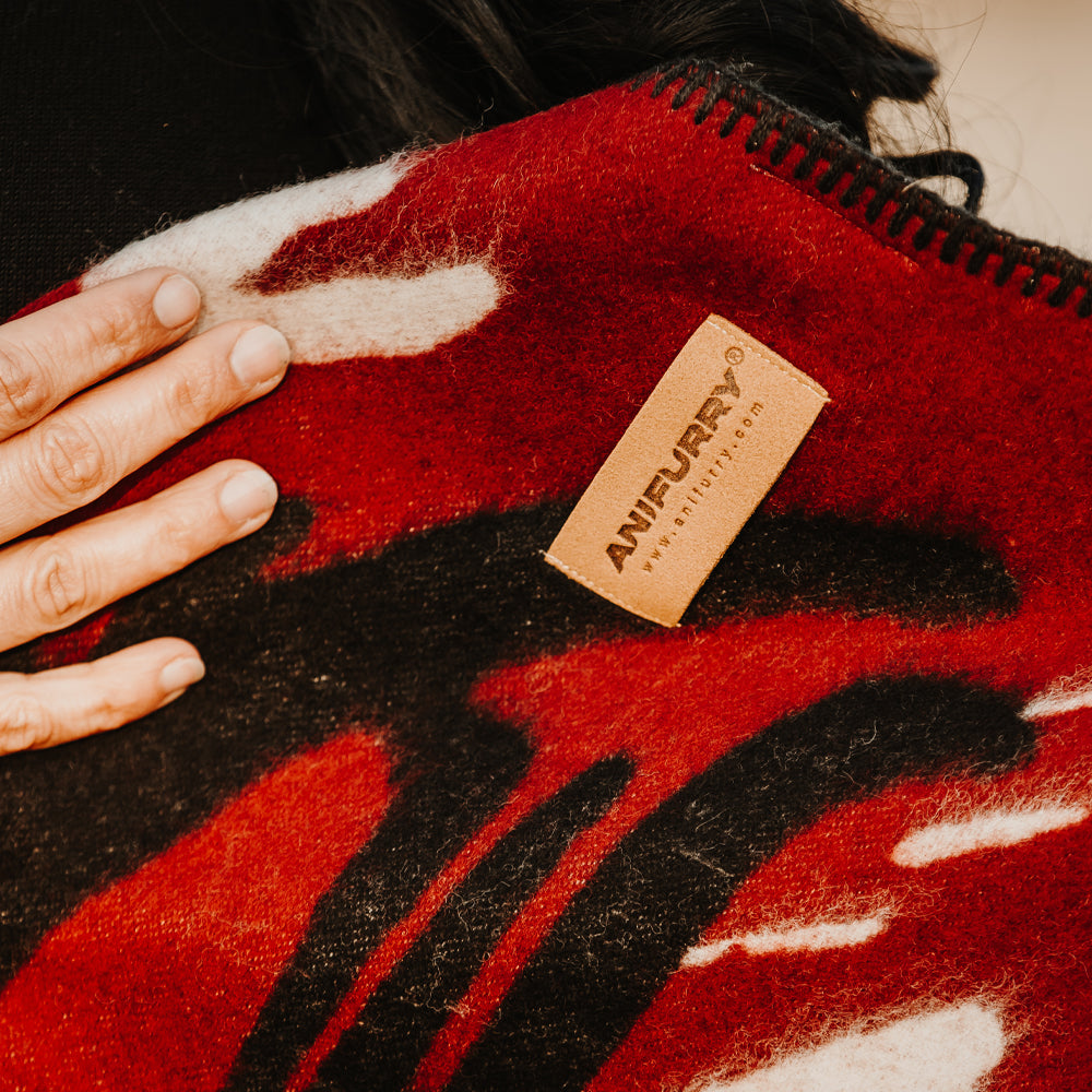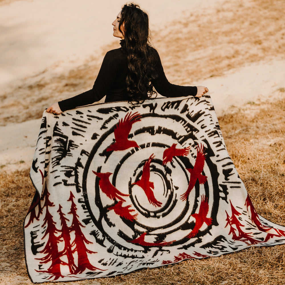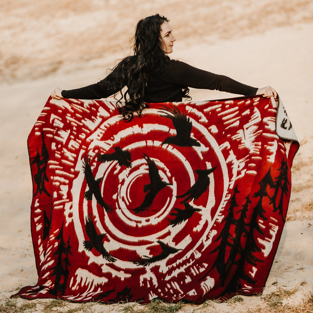 Made of 100% virgin wool, the Raven Blanket offers exceptional warmth, structure, and durability. Its tightly woven construction gives it a thick feel — perfect for cold mornings, open landscapes, or cozy evenings indoors. In many Indigenous traditions, the raven is seen as a messenger and shapeshifter — a guide between worlds. This blanket captures that energy in bold, dynamic patterns that echo both nature’s wild rhythm and sacred intention.