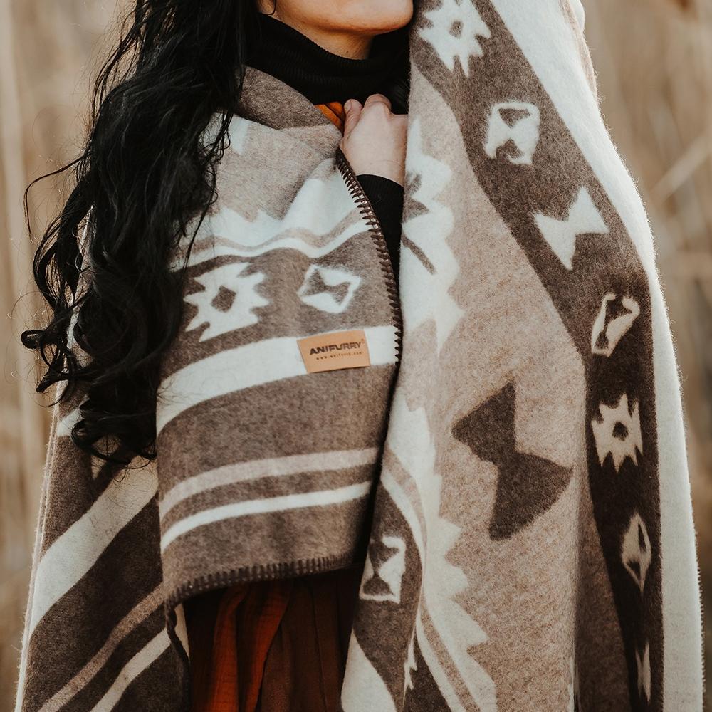 Woven from 100% virgin wool, the Wakan Tanka Blanket brings together warmth, tradition, and spirit. Its bold, geometric design is inspired by the sacred force of Wakan Tanka — the Great Spirit that flows through all living things in Native teachings. With every fold, it grounds you in a sense of strength and stillness, echoing the wisdom of the land and sky. Whether you're wrapped up on a cold morning or setting the tone for your space, this blanket invites you to connect — deeply, soulfully, and beautifully.